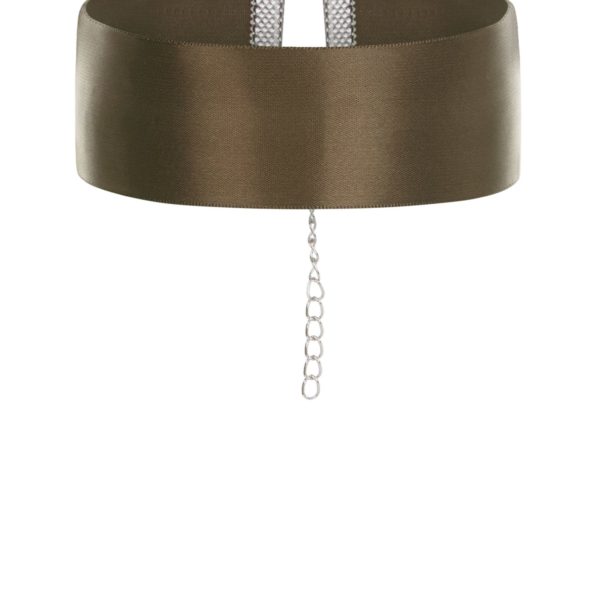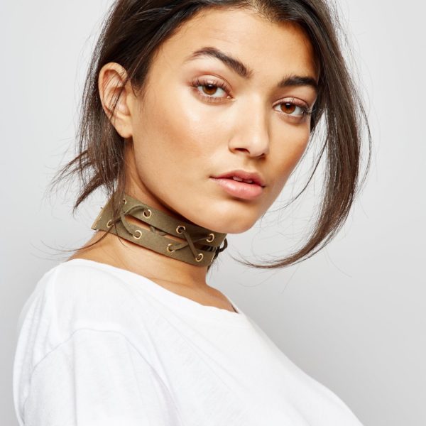Khaki hasított bőr fűzős nyakpánt, pink szalaggal