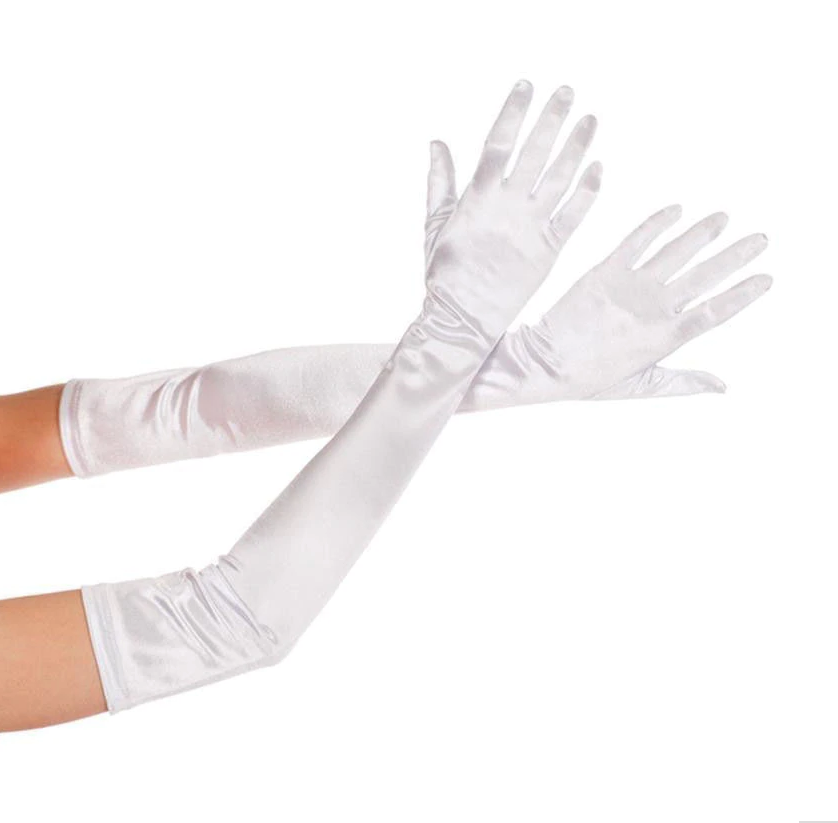 Egy pár könyékig érő fehér szaténkesztyű, egyméret.