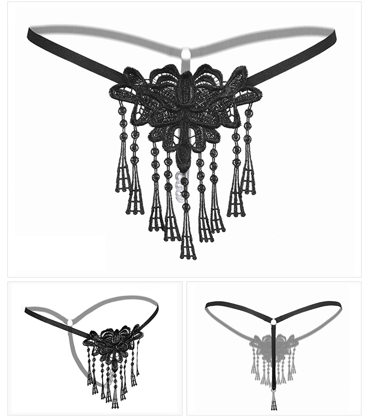 Gazdagon díszített, fekete csipkés tanga gyöngysorral, egyméret