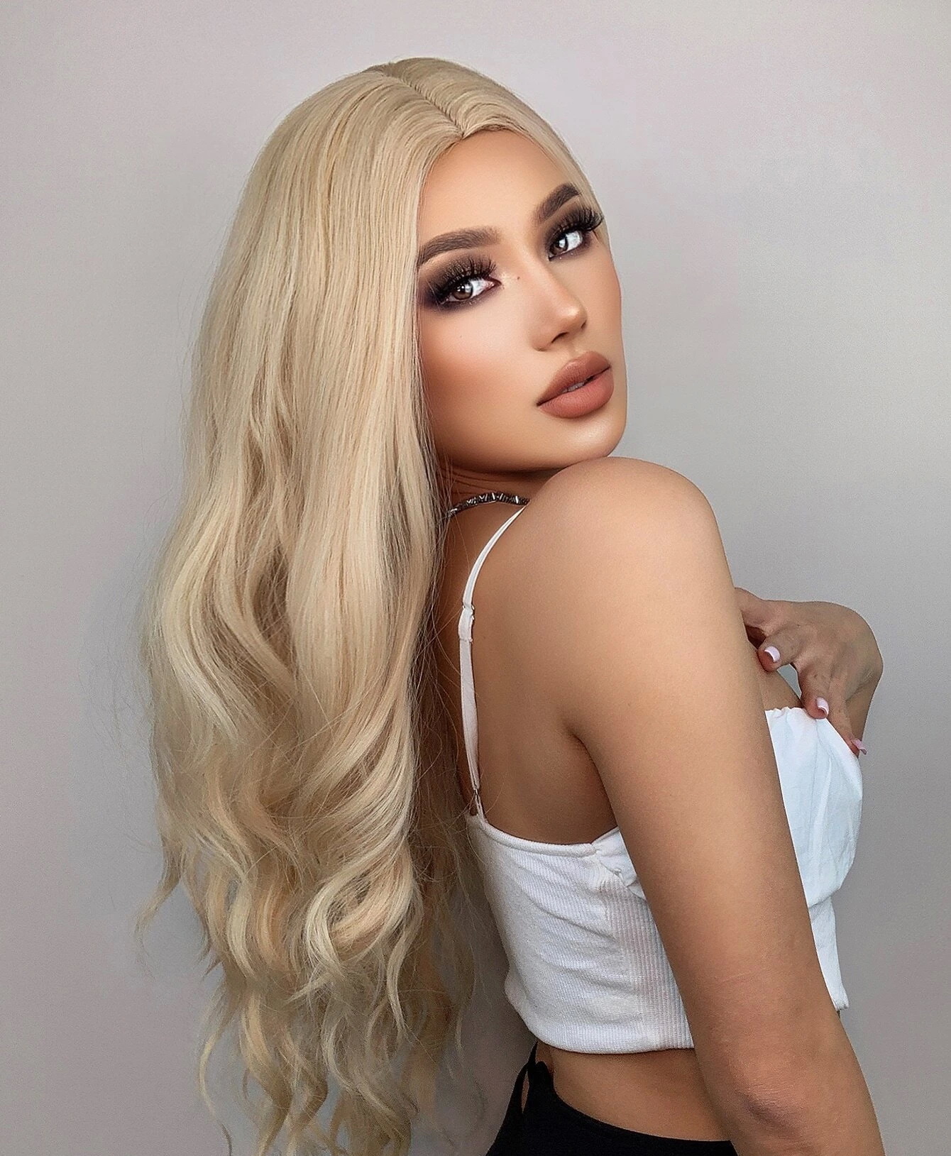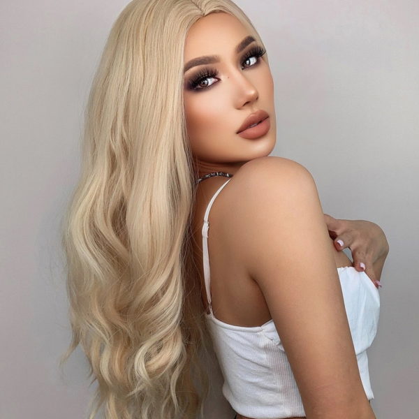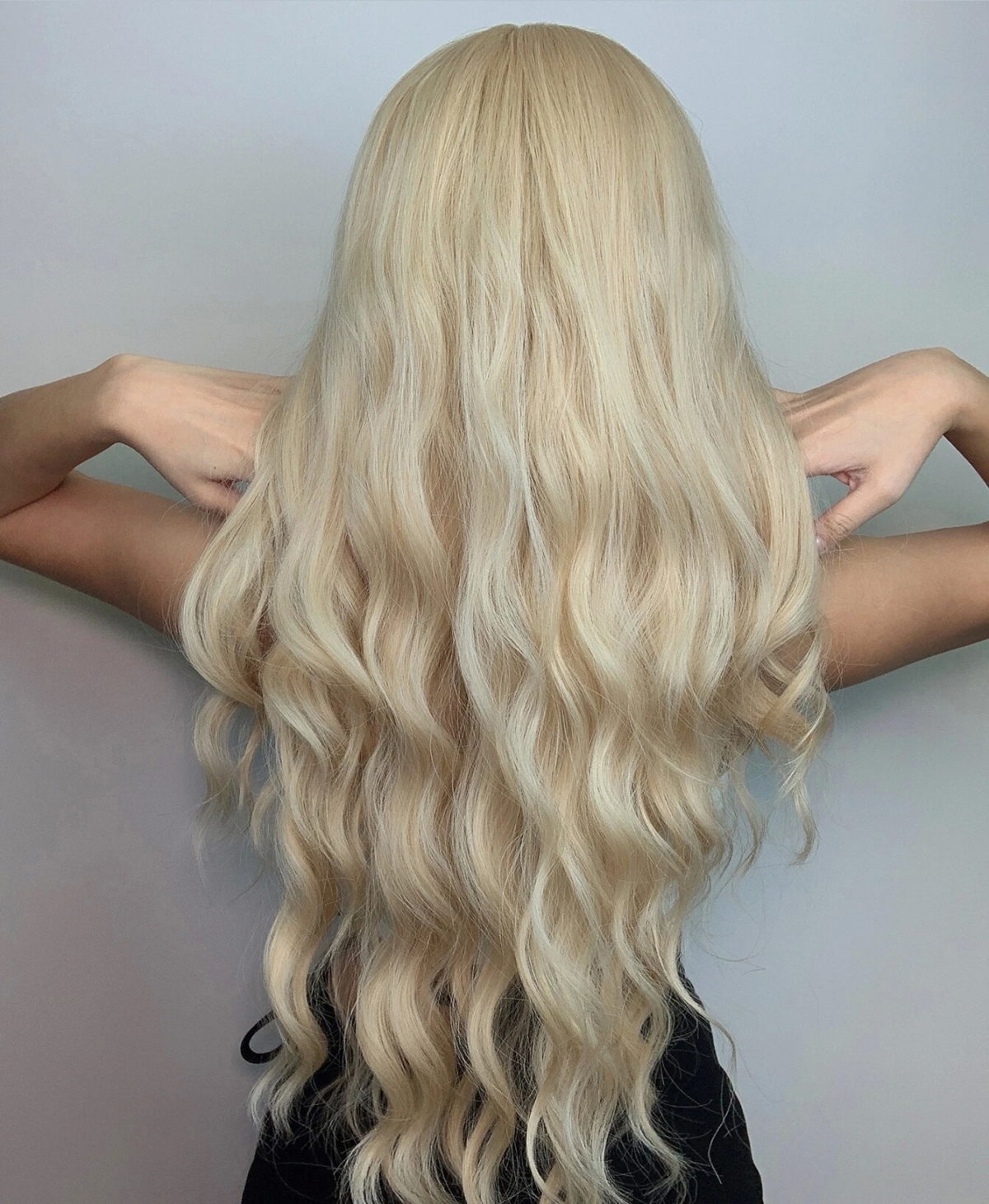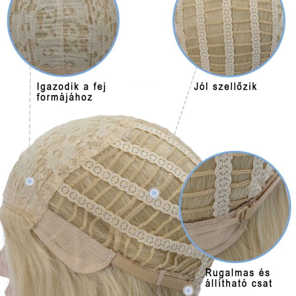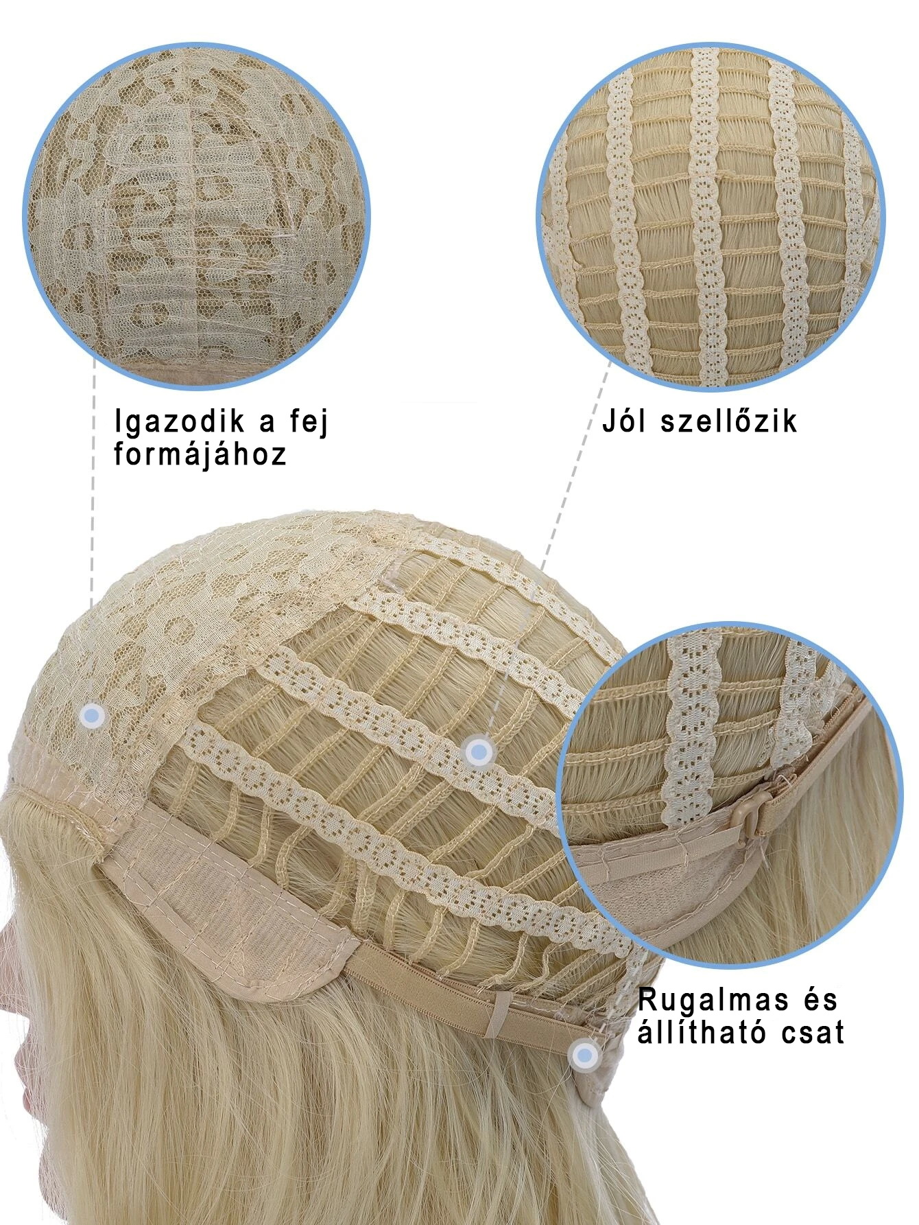 Szőke paróka, hosszú, hullámos. Tartós, mindennapi viseletre is.