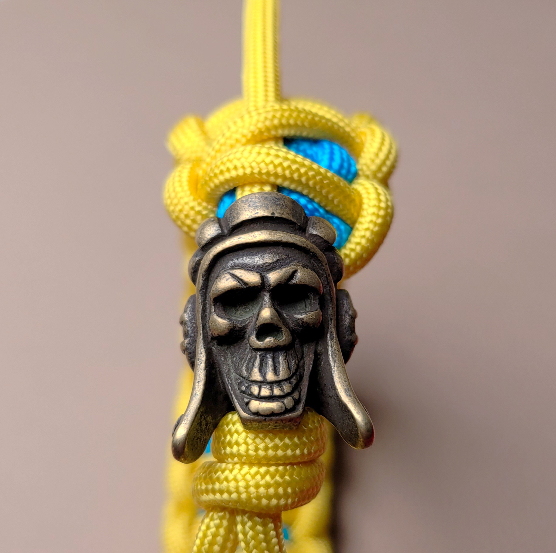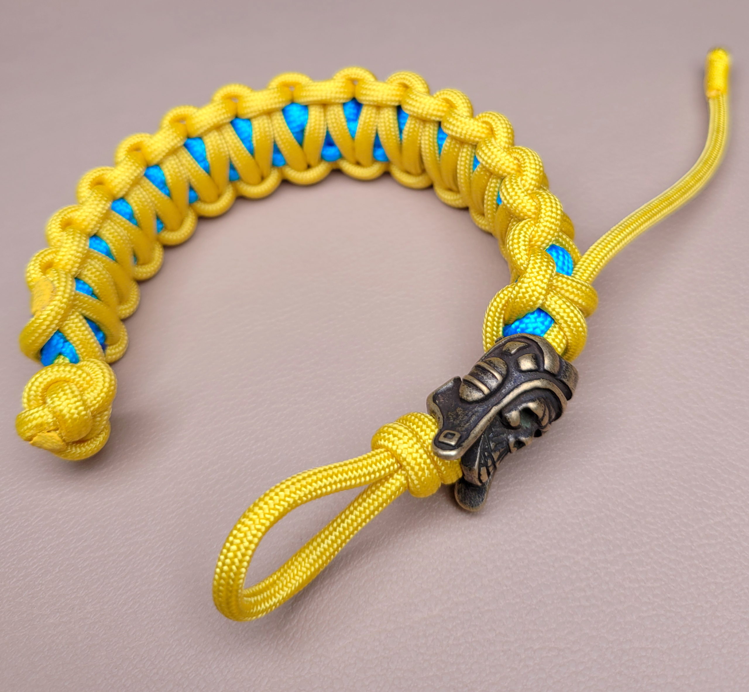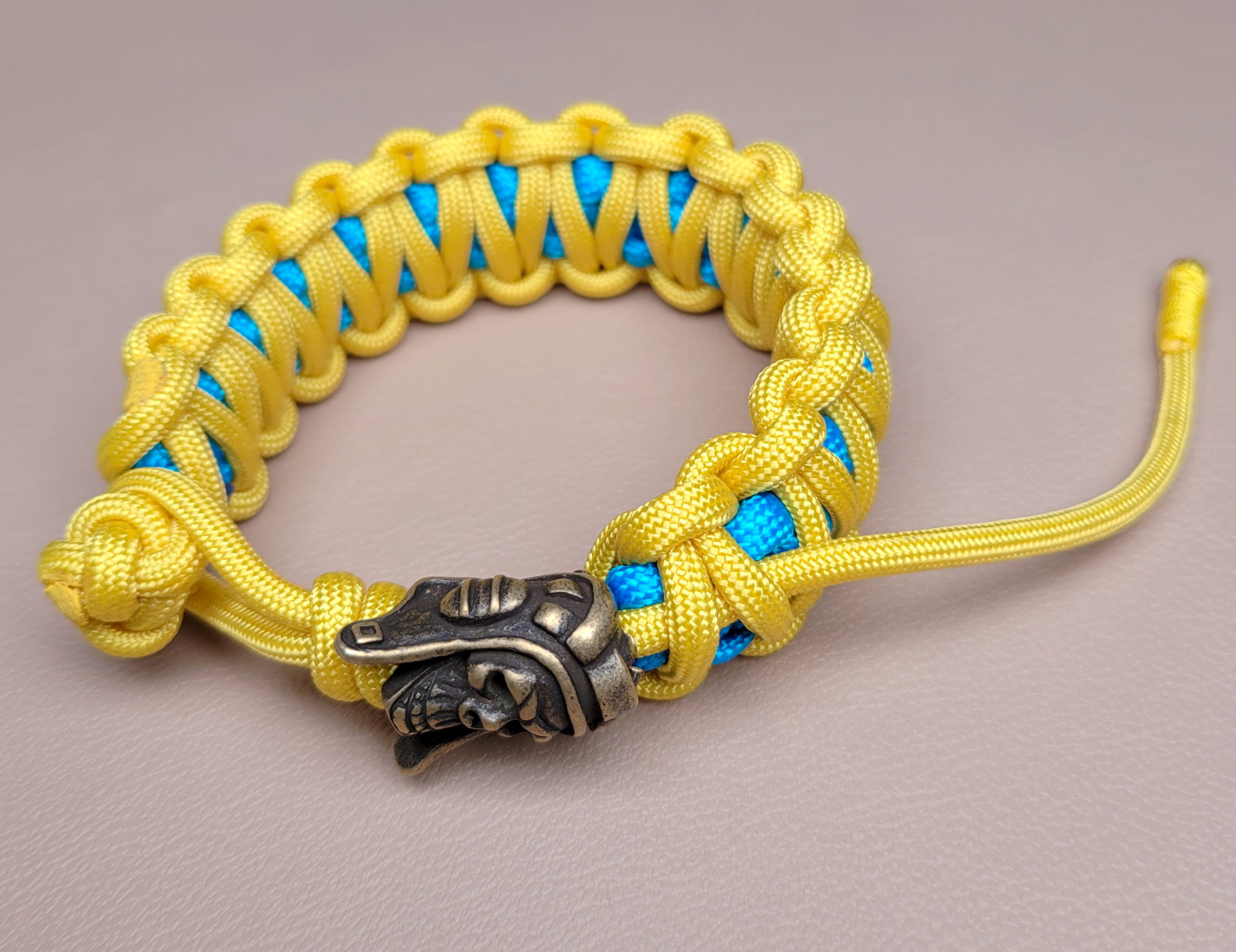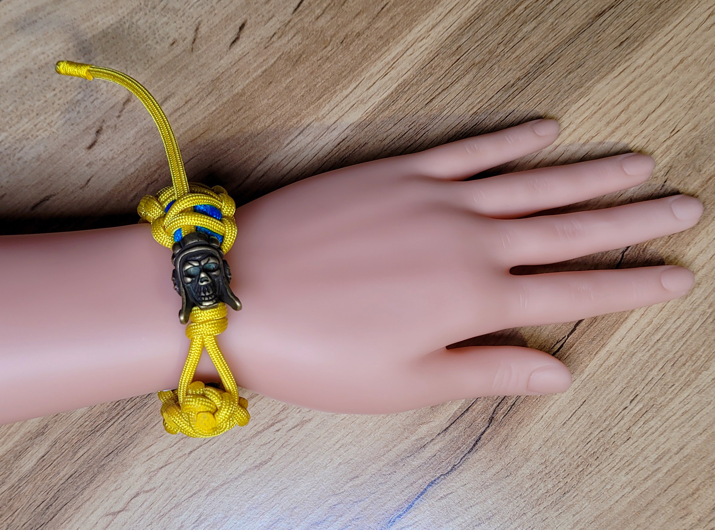 Egyedi, kézzel készített paracord karkötő, kiváló minőségű bronz dísszel. A lezáró hurok bősége változtatható, ezzel a karkötő szorossága is, a különálló szál meghúzásával.