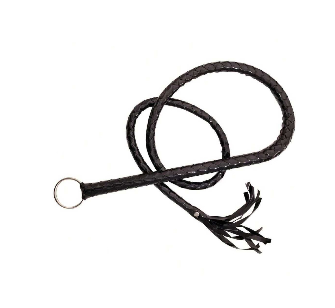 Fonott, lakk hatású, ostor PU bőrből, akasztó-gyűrűvel a végén.