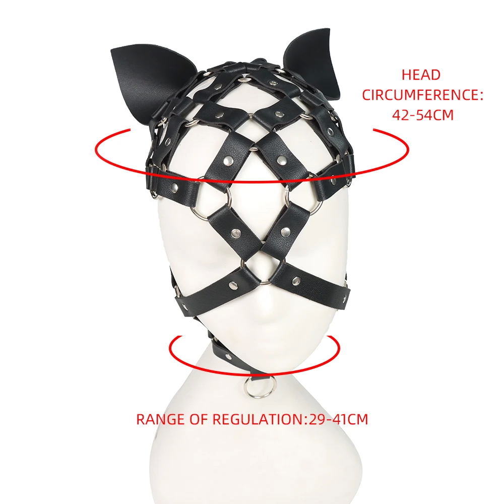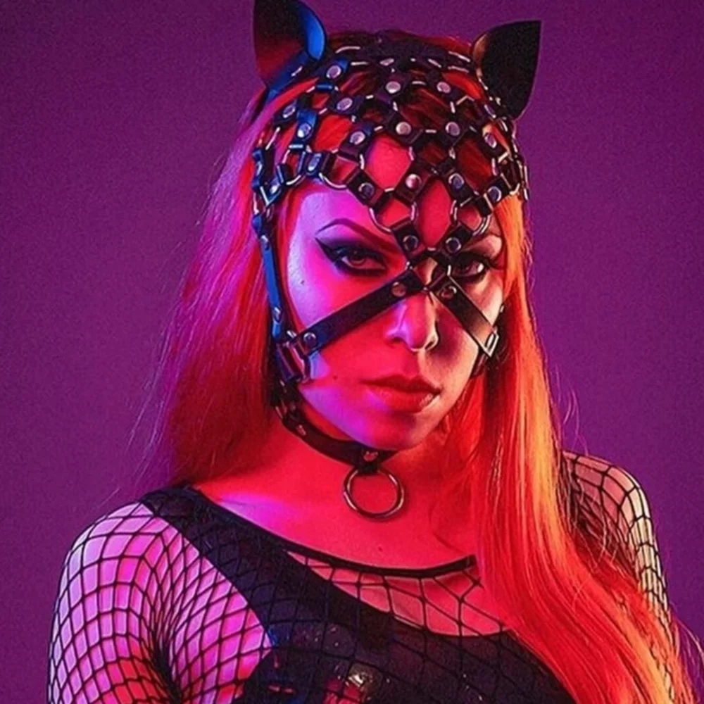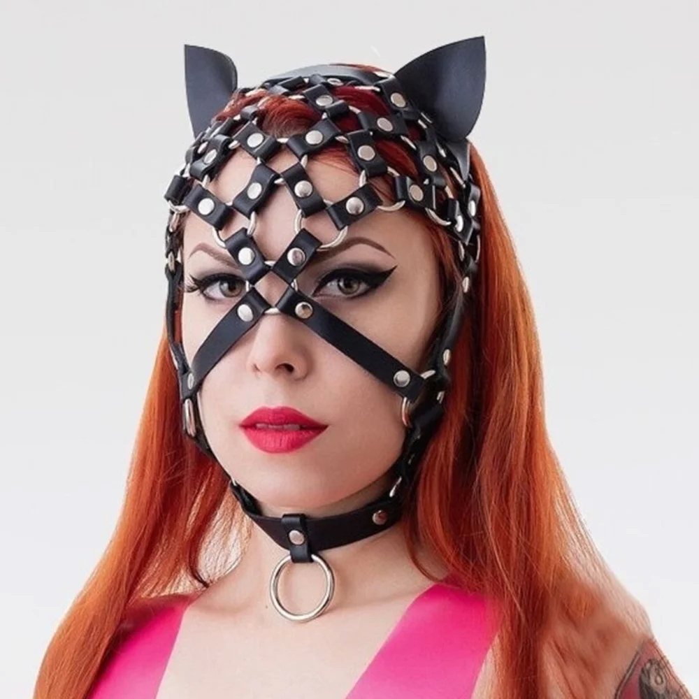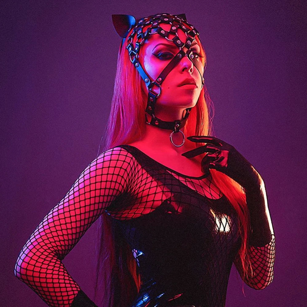 Szexi macskanő fejmaszk nyakörvvel, szerepjátékokhoz.
