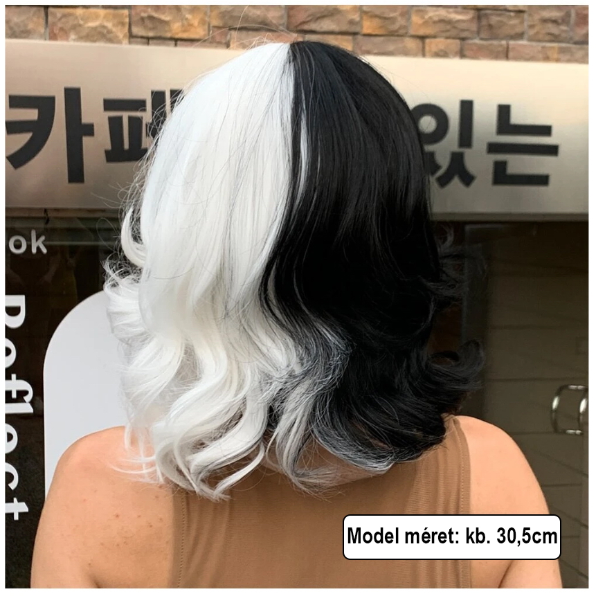 Szörnyella, bob-fazonú, hullámos paróka, tartós (fekete-fehér) kb. 30 cm