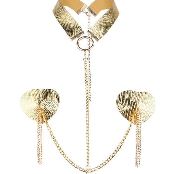 Szív alakú láncos mellbimbó takaró, nyakörvvel, állítható méret, arany-szín